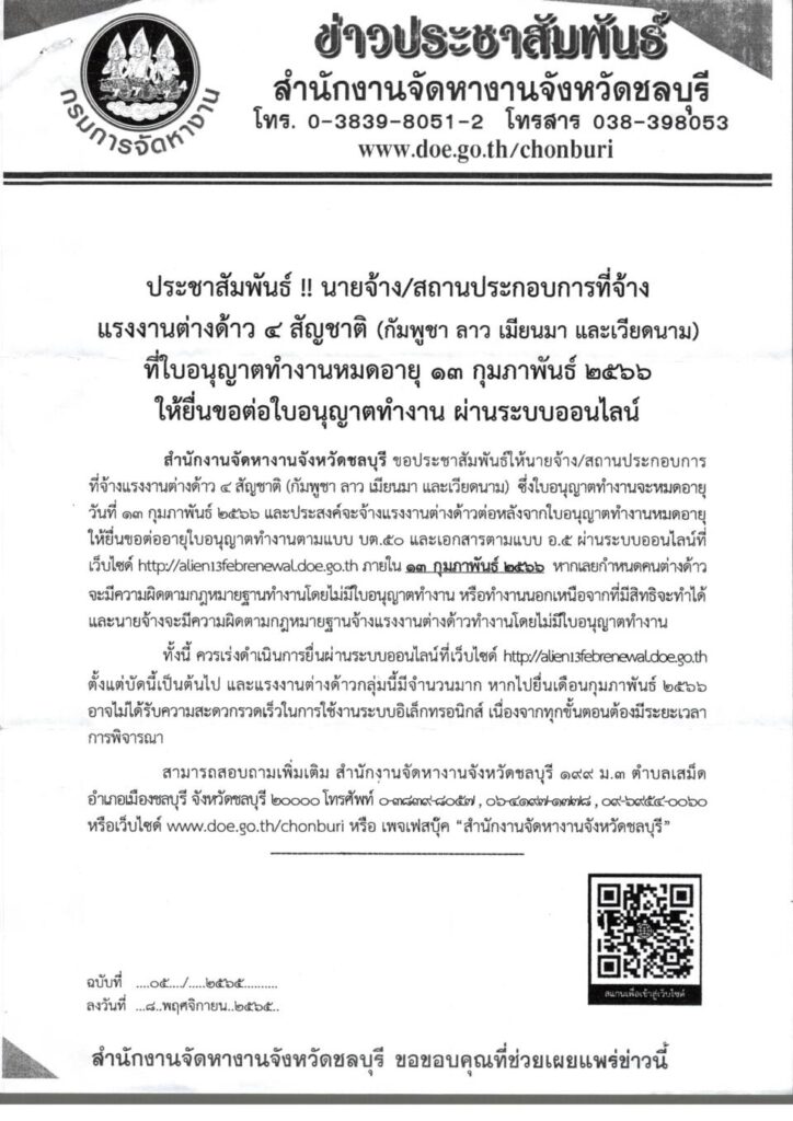 เรื่อง การต่อใบอนุญาตทำงาน แรงงานต่างด้าว 4 สัญชาติ ข่าวประชาสัมพันธ์ สำนักงานจัดหางานจังหวัดชลบุรี เรื่อง การต่อใบอนุญาตทำงาน แรงงานต่างด้าว 4 สัญชาติ (กัมพูชา, ลาว, เมียนมา และเวียดนาม) ผ่านระบบออนไลน์ ตามเอกสารแนบท้ายนี้