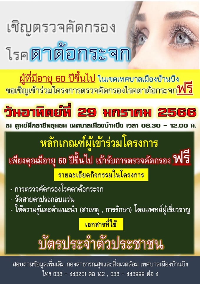 โครงการตรวจคัดกรองโรคตาต้อกระจกฟรี เทศบาลเมืองบ้านบึง ขอเชิญประชาชนในเขตเทศบาล ที่มีอายุ 60 ปีขึ้นไป เข้าร่วมโครงการตรวจคัดกรองโรคตาต้อกระจกฟรี โดยไม่มีค่าใช้จ่าย ในวันอาทิตย์ที่ 29 มกราคม 2566 เวลา 08.30 – 12.00 น. ณ ศูนย์ฝึกอาชีพชุมชน เทศบาลเมืองบ้านบึง เอกสารที่ใช้ – บัตรประจำตัวประชาชน