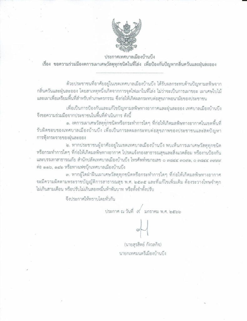 ประกาศเทศบาลเมืองบ้านบึง ขอความร่วมมืองดการเผาเศษวัสดุทุกชนิดในที่โล่ง เพื่อป้องกันปัญหากลิ่นควันและฝุ่นละออง