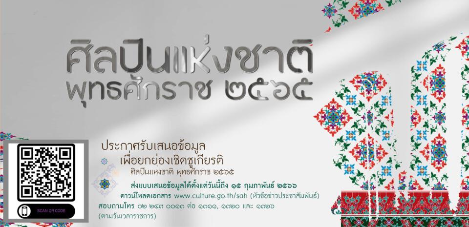 กรมส่งเสริมวัฒนธรรม (สวธ.) กระทรวงวัฒนธรรม ขอเชิญองค์กร หน่วยงานเครือข่ายทางวัฒนธรรม และศิลปินแห่งชาติ เสนอรายชื่อบุคคลผู้สร้างสรรค์ผลงานศิลปะ เพื่อเข้ารับการพิจารณาคัดเลือกเป็นศิลปินแห่งชาติ พุทธศักราช ๒๕๖๕ เปิดรับสมัครตั้งแต่วันที่ ๑๖ ธันวาคม ๒๕๖๕ – ๑๕ กุมภาพันธ์ ๒๕๖๖