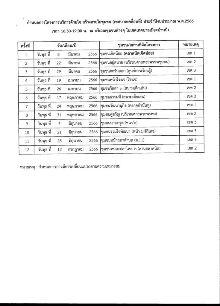 กำหนดการโครงการบริการด้วยใจ สร้างสายใยชุมชน (เทศบาลเคลื่อนที่) ประจำปีงบประมาณ พ.ศ. 2566 เวลา 16.30 – 19.00 น. ณ บริเวณชุมชนต่างๆ ในเขตเทศบาลเมืองบ้านบึง