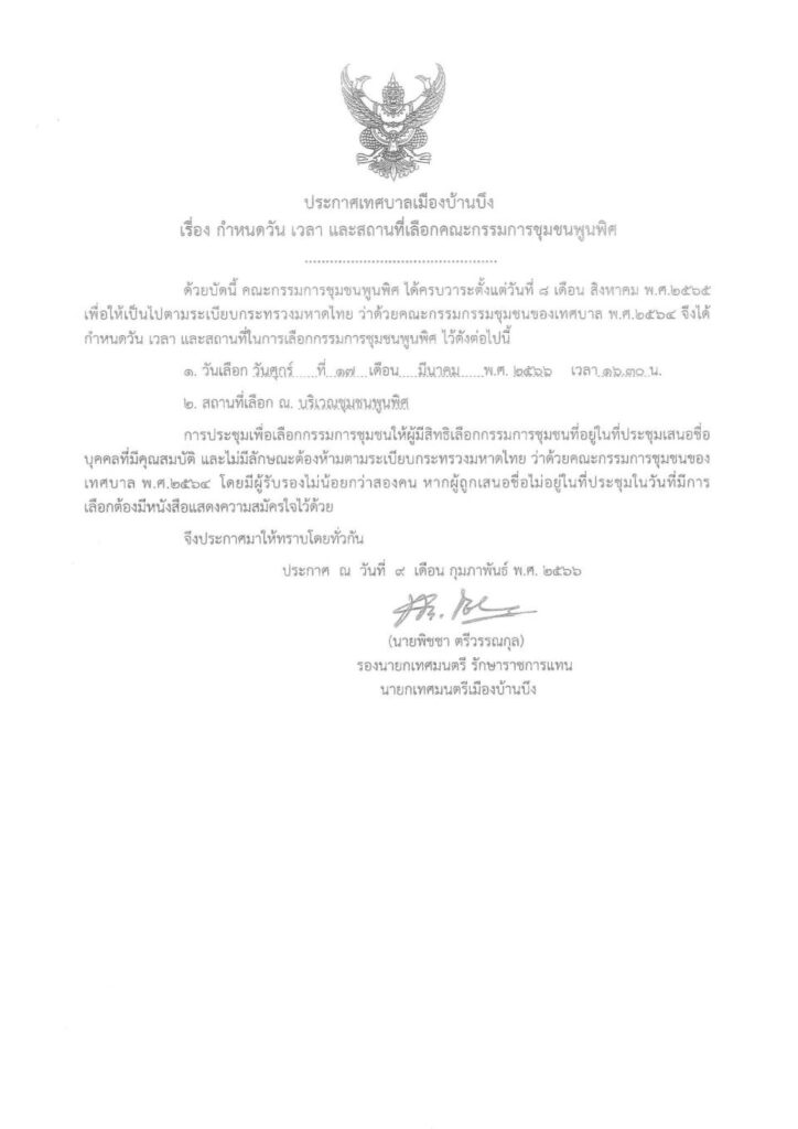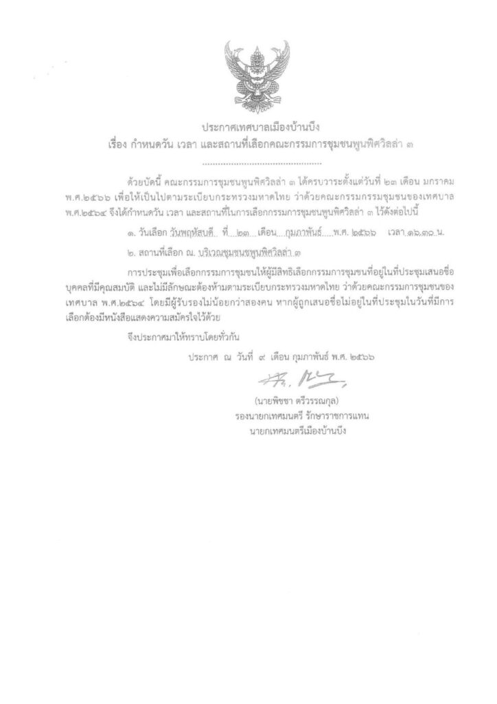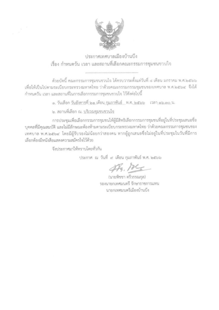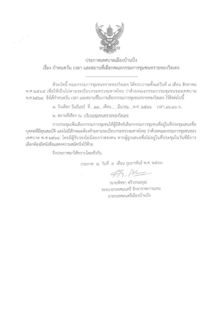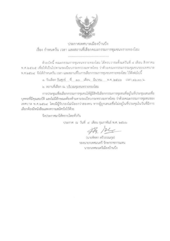 ประกาศเทศบาลเมืองบ้านบึง เรื่อง กำหนดวัน เวลา และสถานที่เลือกคณะกรรมการชุมชนชวนใจ, ชุมชนพูนพิศวิลล่า 3, ชุมชนทรายทองวิลเลจ, ชุมชนทรายทองโฮม และชุมชนพูนพิศ