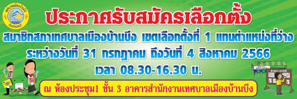 สมาชิกสภาเทศบาลเมืองบ้านบึง เขตเลือกตั้งที่ 1 แทนตำแหน่งที่ว่าง ระหว่างวันที่ 31 กรกฎาคม ถึงวันที่ 4 สิงหาคม 2566 เวลา 08.30-16.30 น.