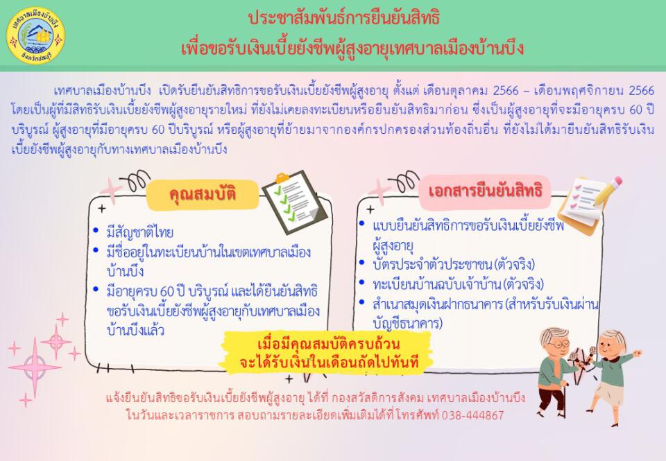เทศบาลเมืองบ้านบึง เปิดรับยืนยันสิทธิการขอรับเงินเบี้ยยังชีพผู้สูงอายุตั้งแต่เดือนตุลาคม 2566 – เดือนพฤศจิกายน 2566 โดยเป็นผู้ที่มีสิทธิรับเงินเบี้ยยังชีพผู้สูงอายุรายใหม่ที่ยังไม่เคยลงทะเบียนหรือยืนยันสิทธิมาก่อน ซึ่งเป็นผู้สูงอายุที่จะมีอายุครบ 60 ปีบริบูรณ์ ผู้สูงอายุที่มีอายุครบ 60 ปีบริบูรณ์ หรือผู้สูงอายุที่ย้ายมาจากองค์กรปกครองส่วนท้องถิ่นอื่น ที่ยังไม่ได้มายืนยันสิทธิรับเงินเบี้ยยังชีพผู้สูงอายุกับทางเทศบาลเมืองบ้านบึง