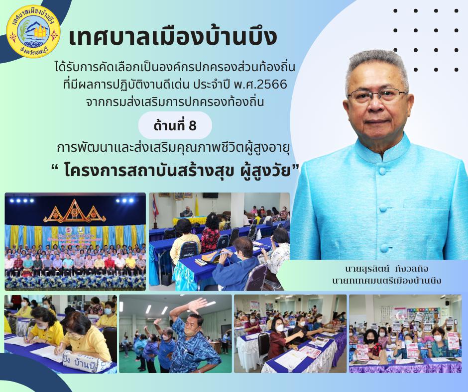 เทศบาลเมืองบ้านบึง ได้รับการคัดเลือกเป็นองค์กรปกครองส่วนท้องถิ่นที่มีผลการปฏิบัติงานดีเด่น ประจำปี พ.ศ.2566 เทศบาลเมืองบ้านบึง ได้รับการคัดเลือกเป็นองค์กรปกครองส่วนท้องถิ่นที่มีผลการปฏิบัติงานดีเด่น ประจำปี พ.ศ.2566 จากกรมส่งเสริมการปกครองท้องถิ่น ด้านที่ 8 การพัฒนาและส่งเสริมคุณภาพชีวิตผู้สูงอายุ โครงการสถาบันสร้างสุข ผู้สูงวัย