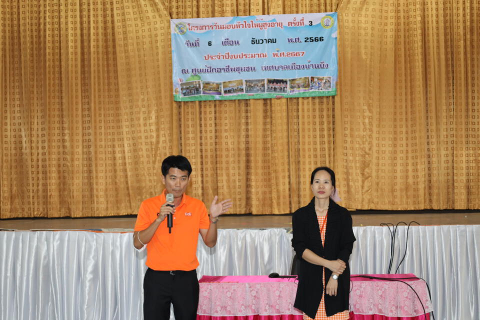 วันพุธที่ 6 ธันวาคม 2566 กองสวัสดิการสังคม เทศบาลเมืองบ้านบึง จัดโครงการวันมอบหัวใจให้ผู้สูงอายุ ครั้งที่ 3โดยมีนายสุรสิตย์ กังวลกิจ นายกเทศมนตรีเมืองบ้านบึง ได้กล่าวพบปะพูดคุย และชี้แจงการขับเคลื่อนงานด้านต่างๆ ของผู้สูงอายุ ซึ่งภายในงานประกอบด้วยกิจกรรมต่าง ๆ ดังนี้