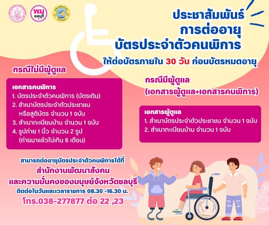 สามารถต่อบัตรประจำตัวคนพิการได้ที่ สำนักงานพัฒนาสังคมและความมั่นคงของมนุษย์ จังหวัดชลบุรี 038-277877 ต่อ 22, 23 ในวันและเวลาราชการ