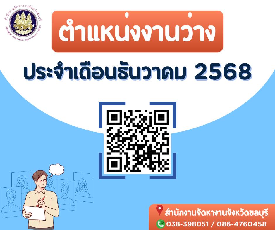 ประชาสัมพันธ์ตำแหน่งงานว่าง ประจำเดือนธันวาคม 2568 จาก สำนักงานจัดหางานจังหวัดชลบุรี โทรสอบถามเพิ่มเติมได้ที่ ( 038-398-051 ) ฝ่ายส่งเสริมการมีงานทำ ผู้ที่สนใจจะสมัครงาน สามารถติดต่อสถานประกอบการด้วยตนเอง เนื่องจากตำแหน่งงานว่างมีการเปลี่ยนแปลงอยู่ตลอดเวลา