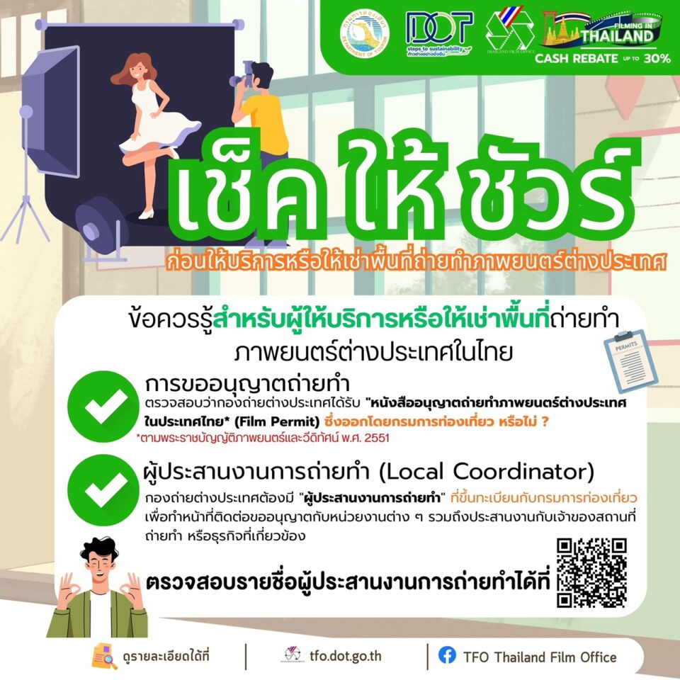 กองกิจการภาพยนตร์และวีดิทัศน์ต่างประเทศ (Thailand Film Office : TFO) กรมการท่องเที่ยว ขอความร่วมมือทุกท่านดำเนินการตรวจสอบเอกสารก่อนให้บริการแก่กองถ่ายต่างประเทศ ดังนี้