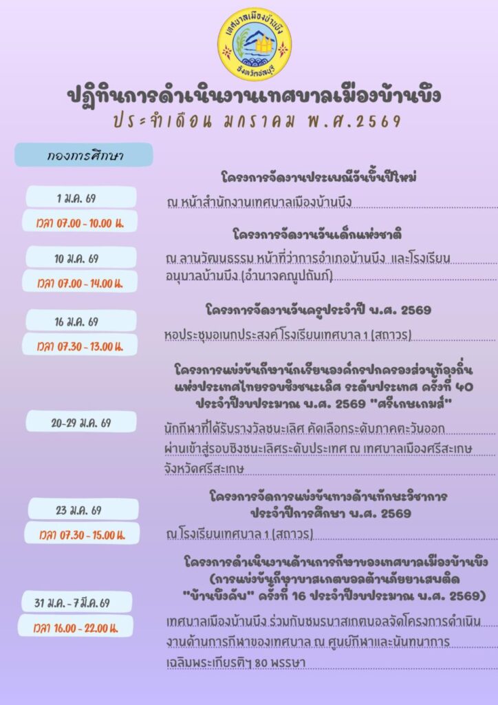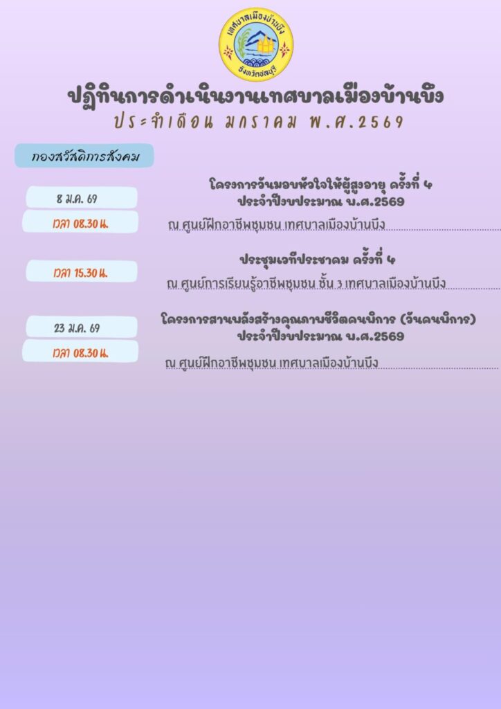 ปฏิทินการดำเนินงานของเทศบาลเมืองบ้านบึง ประจำเดือนมกราคม พ.ศ. 2569
