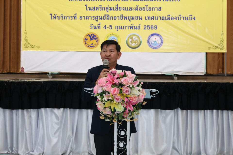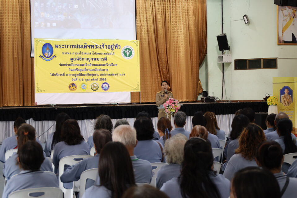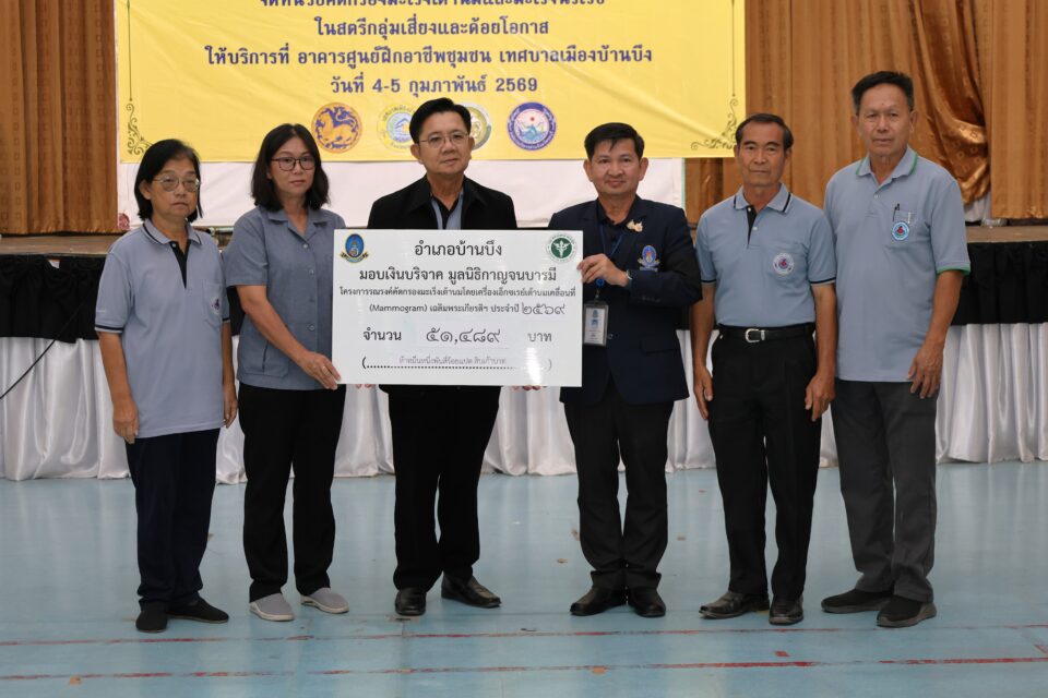 วันที่ 4 กุมภาพันธ์ 2569 เวลา 09.00 น. ณ ศูนย์ฝึกอาชีพชุมชน เทศบาลเมืองบ้านบึง ว่าที่ร้อยตรีศราวุธ กรจิระเจริญ นายอำเภอบ้านบึงเป็นประธานกล่าวเปิดโครงการคัดกรองมะเร็งเต้านมโดยเครื่องเอกซเรย์เต้านมเคลื่อนที่ (Mammogram) และคัดกรองมะเร็งนรีเวชในสตรีกลุ่มเสี่ยงและด้อยโอกาส 4 หน่วย 4 ภาค ทั่วประเทศ 🩺เนื่องในโอกาสพระราชพิธีมหามงคลเฉลิมพระชนมพรรษา พระบาทสมเด็จพระเจ้าอยู่หัว 6 รอบ 28 กรกฎาคม 2567 โดยแพทย์หญิงแววดาว พิมลธเรศ ผู้อำนวยการโรงพยาบาลบ้านบึง กล่าวรายงาน โดยมีนายสุรสิตย์ กังวลกิจ นายกเทศมนตรีเมืองบ้านบึง ร่วมเป็นเกียรติในพิธี พร้อมด้วยคณะผู้บริหารเทศบาลเมืองบ้านบึง, ผู้แทนมูลนิธิกาญจนบารมี, ผู้แทนจากองค์การบริหารส่วนจังหวัดชลบุรี, ผู้อำนวยการโรงพยาบาลส่งเสริมสุขภาพตำบล ในเขตพื้นที่อำเภอบ้านบึง, บุคลากรสาธารณสุข, หน่วยงานภาครัฐและเอกชน และอาสาสมัครสาธารณสุขประจำหมู่บ้าน เข้าร่วมพิธีเปิดโครงการ