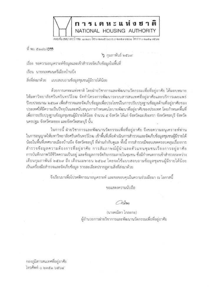 ประชาสัมพันธ์การเข้าพื้นที่เพื่อดำเนินการสำรวจและจัดเก็บข้อมูลชุมชนผู้มีรายได้น้อยในพื้นที่เทศบาลเมืองบ้านบึง จังหวัดชลบุรี
