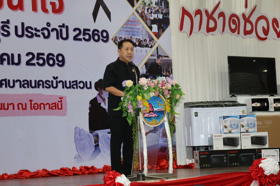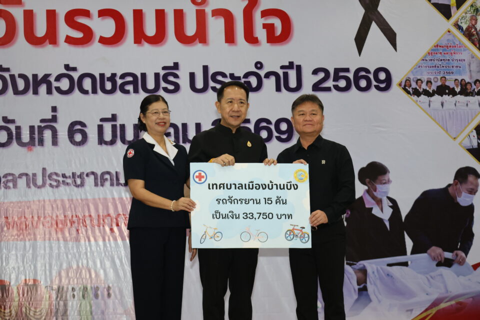 วันที่ 6 มีนาคม 2569 ณ ศาลาประชาคม เทศบาลนครบ้านสวน นายเชวง จินตนาเลิศ รองนายกเทศมนตรีเมืองบ้านบึง มอบรถจักรยาน จำนวน 15 คัน รวมเป็นเงิน 33,750 บาท เพื่อสนับสนุนร้าน “มัจฉากาชาด” ในงาน “วันรวมน้ำใจ” กาชาดจังหวัดชลบุรี ประจำปี 2569