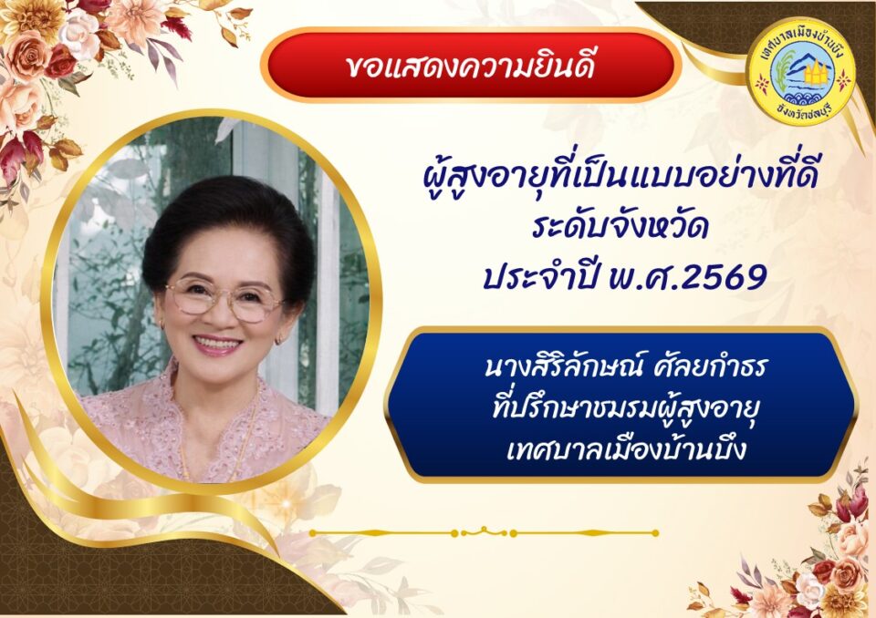 1. นางสิริลักษณ์ ศัลยกำธร ที่ปรึกษาชมรมผู้สูงอายุ เทศบาลเมืองบ้านบึง ได้รับประกาศเกียรติคุณผู้สูงอายุที่เป็นแบบอย่างที่ทางสังคม ระดับจังหวัด ประจำปีงบประมาณ พ.ศ.2569