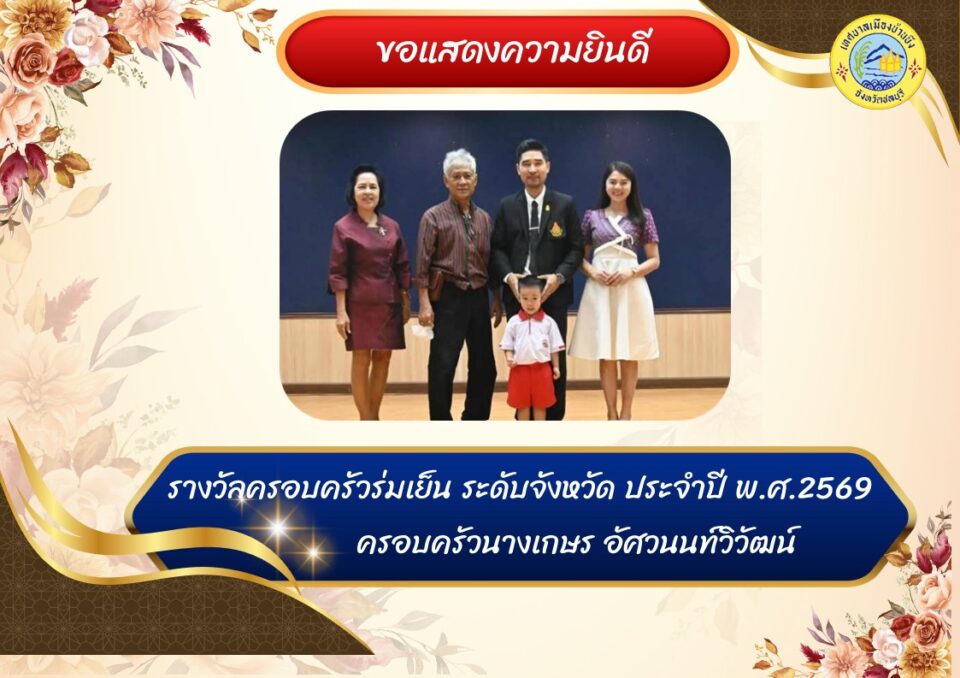 2. นางเกษร อัศวนนท์วิวัฒน์ รองประธานคณะทำงานศูนย์พัฒนาครอบครัวในชุมชน ได้รับโล่เชิดชูเกียรติครอบครัวร่มเย็น ระดับจังหวัด ประจำปีงบประมาณ พ.ศ. 2569