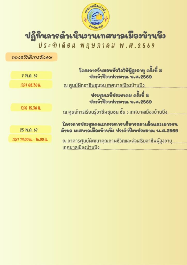 ปฏิทินการดำเนินงานของเทศบาลเมืองบ้านบึง ประจำเดือนพฤษภาคม พ.ศ. 2569