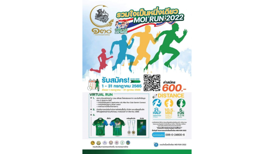 โครงการ รวมใจเป็นหนึ่งเดียว MOI RUN 2022 ขยายเวลาสมัครออนไลน์ ถึงวันที่ 31 สิงหาคม 2565 ตามลิงค์ที่แนบมาพร้อมนี้ https://page.line.me/?accountId=moirun2022&fbclid=IwAR3MRfRHBMYlvXKRnKZ9ji59GGXpqETrYfWnTH4gg8DqfcPVDDDOkLf-bV8